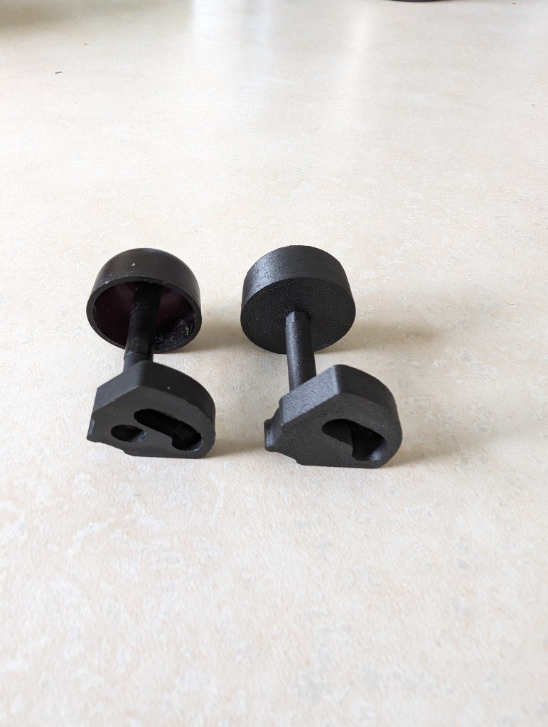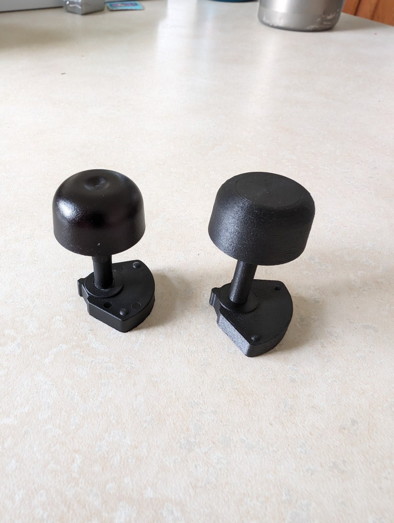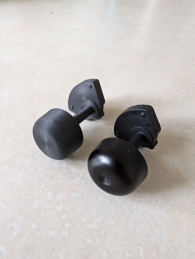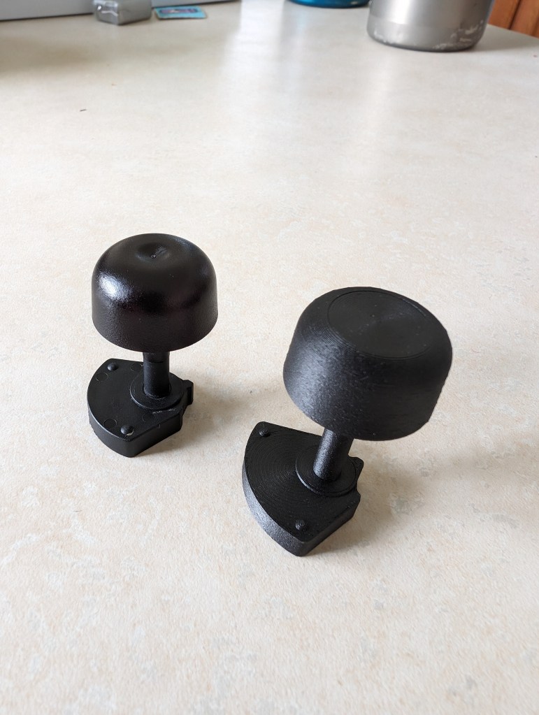 The knobs and cams are printed using PETG-CF filament and a 100% infill. This means they are completely solid parts and have tiny bits of carbon fiber infused into them for added shear resistance.